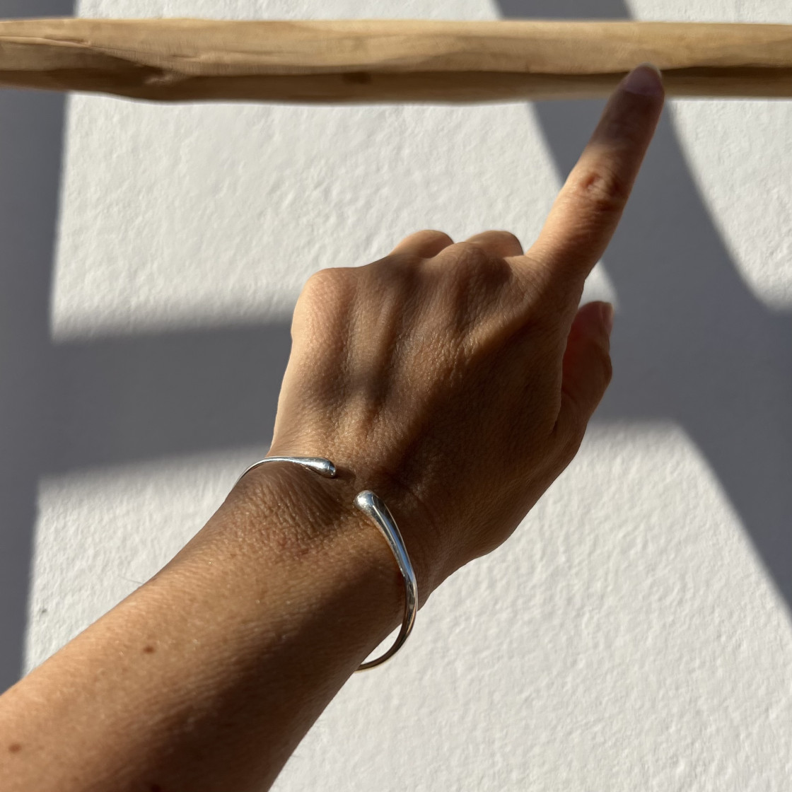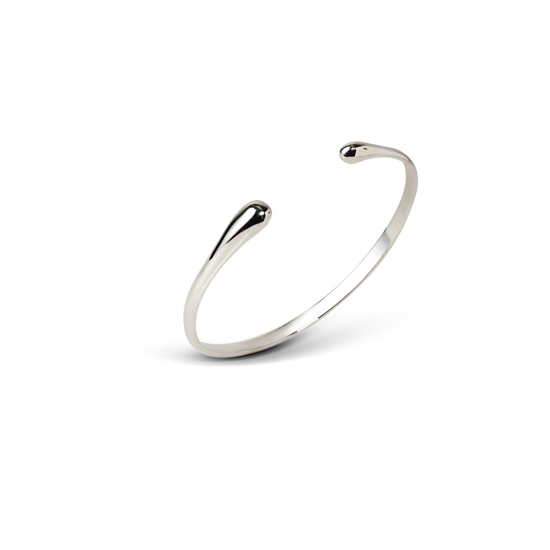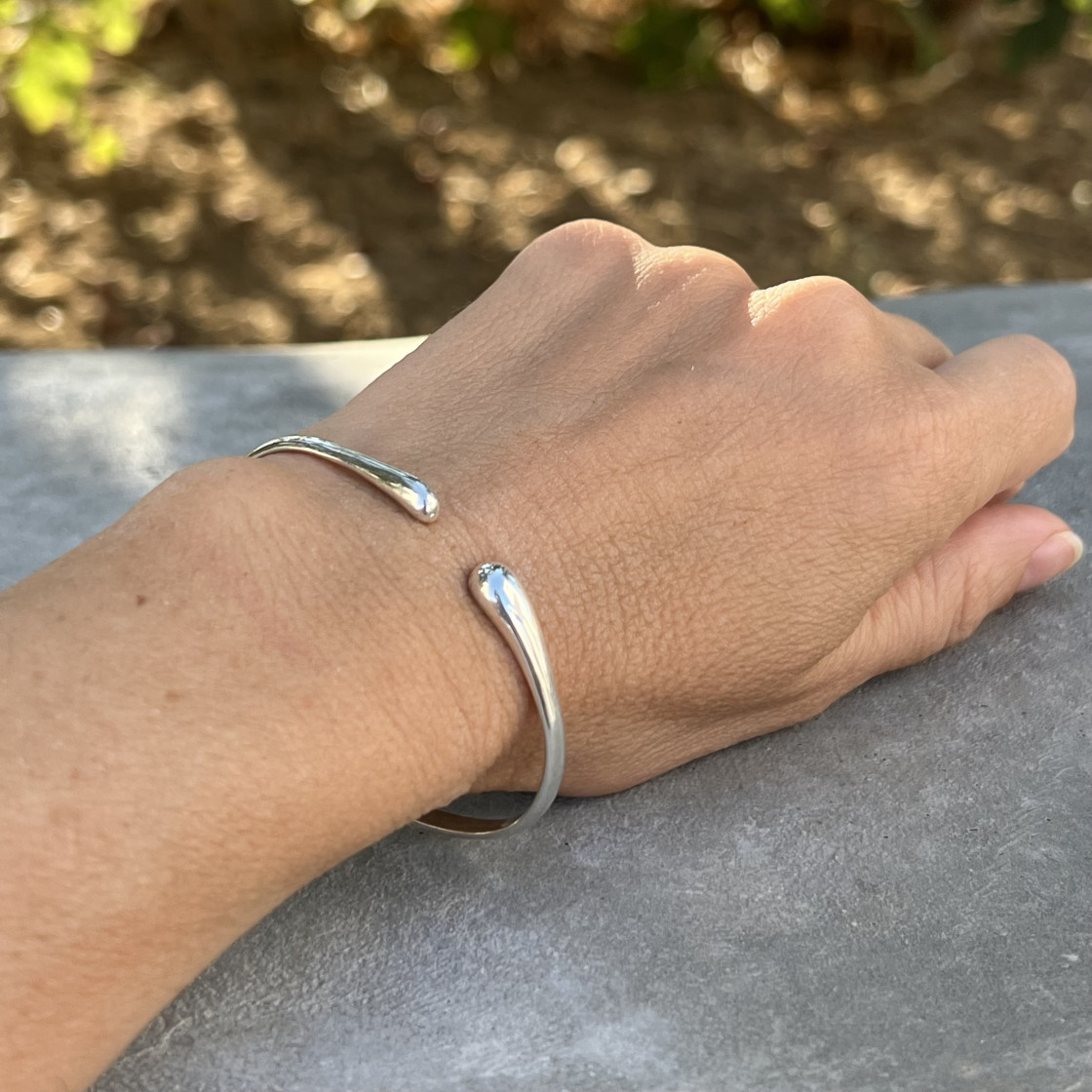 This shimmering silver cuff bracelet captures the essence of flowing water, with its sleek curves and smooth surface resembling the gentle movement of a serene stream.