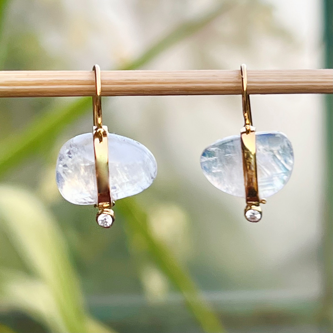 Alluring cabochon moonstones wraped in a 14kt gold band accented with a zirkon stone.