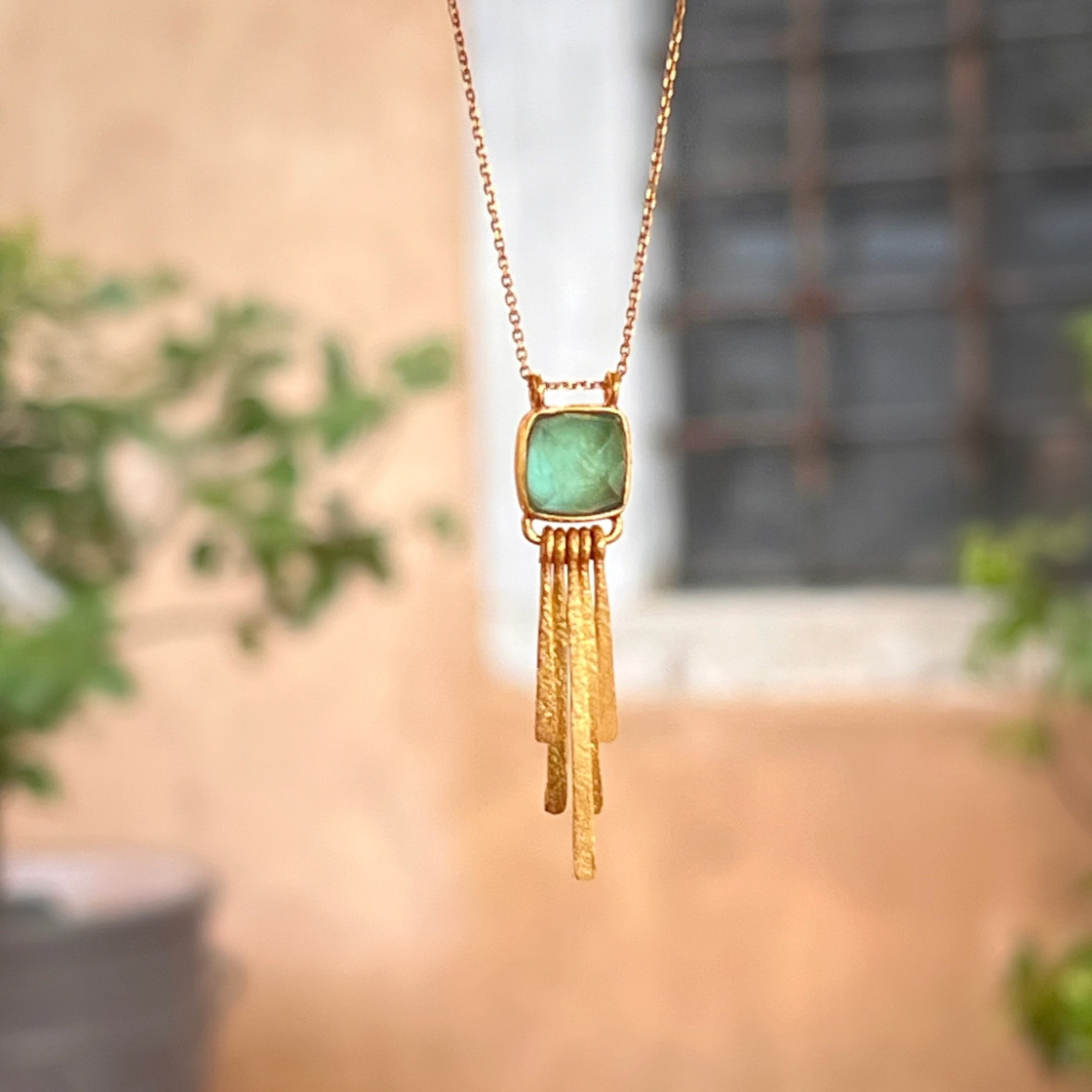 A beauty that marries symmetry with movement. A captivating square Amazonite doublet stone takes center stage, while five graceful gold rays dance beneath, creating an enchanting interplay of form and motion. This necklace is a testament to refined elegance, offering a timeless statement of sophistication.