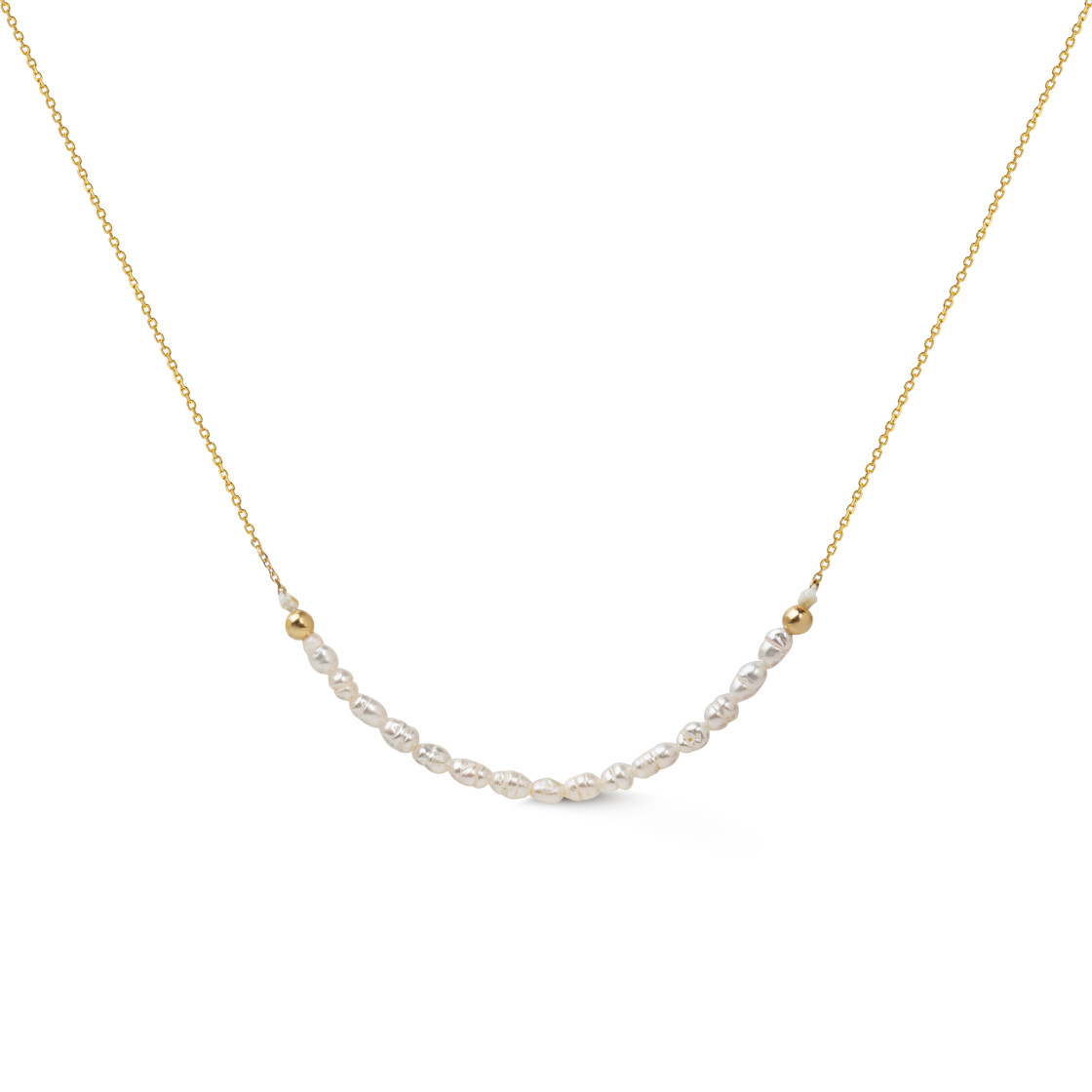 A graceful arrangement of petite freshwater pearls forms a delicate curve on this minimalist necklace. Set on a fine gold chain, this piece radiates understated elegance. Perfect for layering or as a standalone statement, it complements any style effortlessly, from casual to formal.