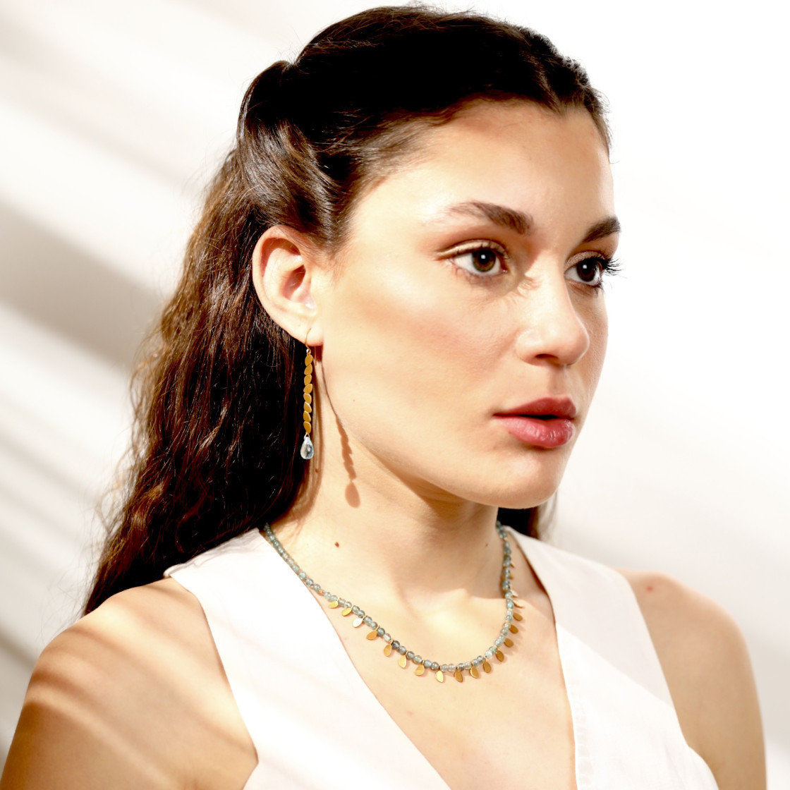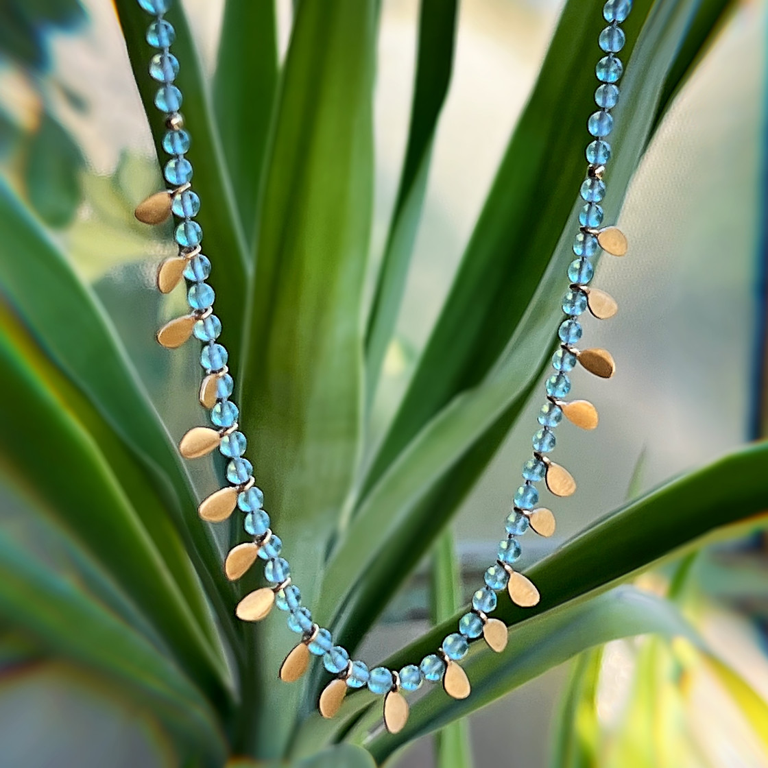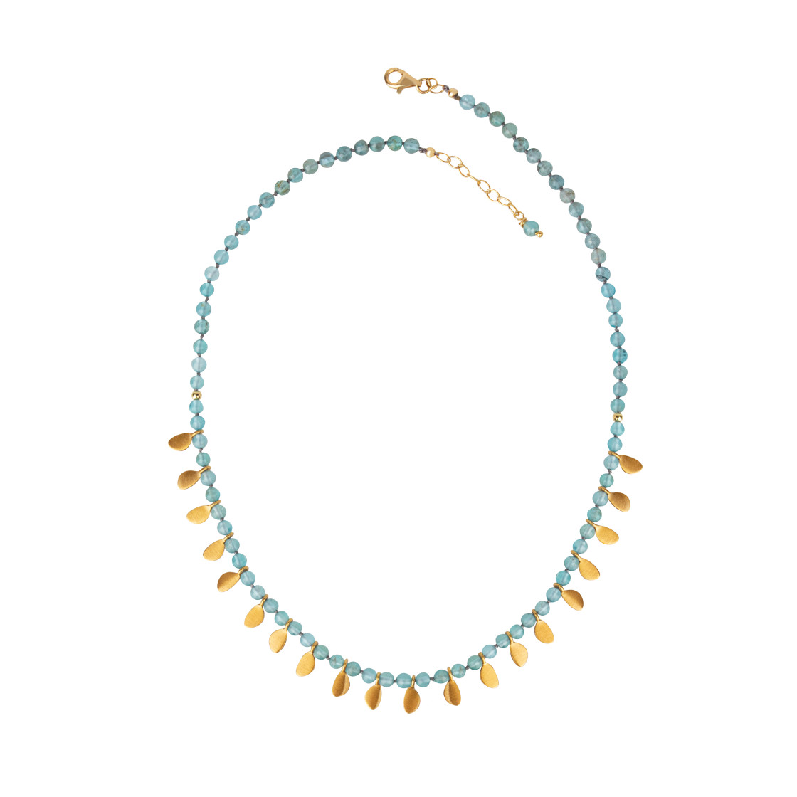 Stone necklace accented with twenty shinny gold drops.