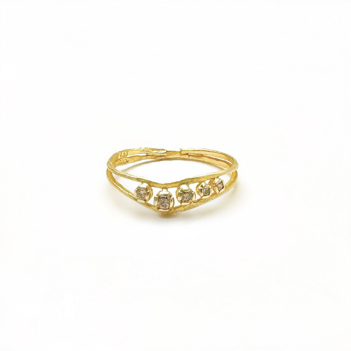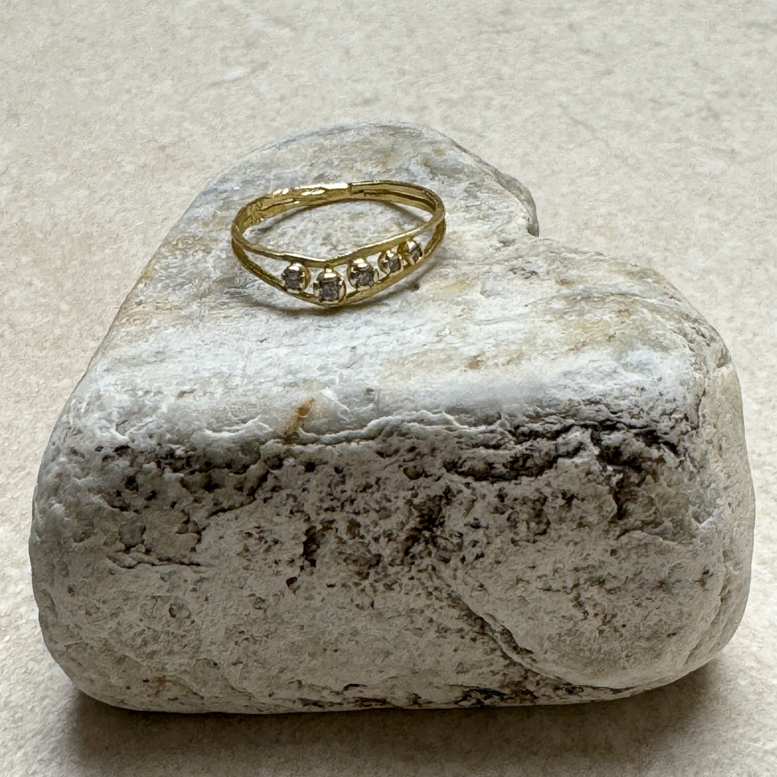 A Delicate ring with Timeless Elegance. A handmade gold ring crafted with care and artistry, featuring a matte finish and a subtle asymmetrical design. The ring resembles two bands, symbolizing unity and balance, with tiny diamonds set gracefully at the center—a perfect touch of brilliance.